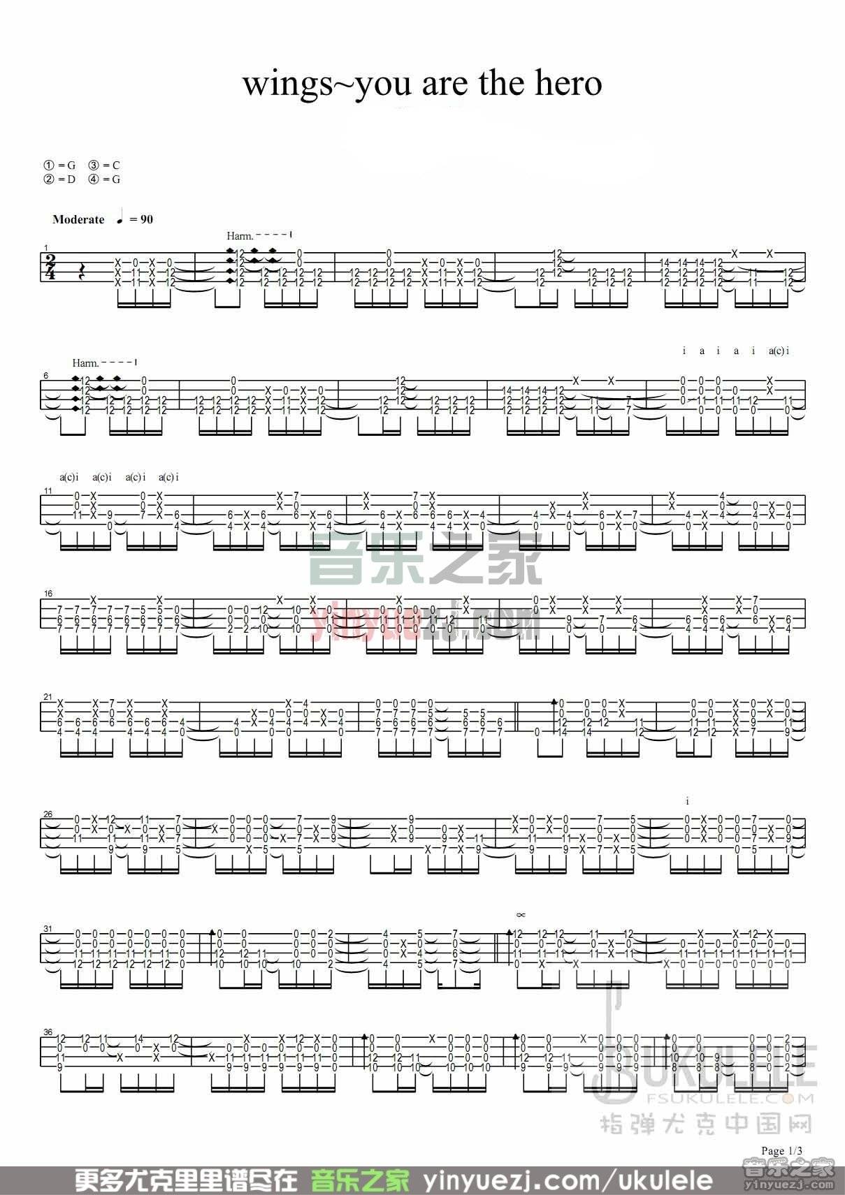 《wings you are the hero》尤克里里谱指弹版 G调六线谱_音乐之家编配_押尾桑