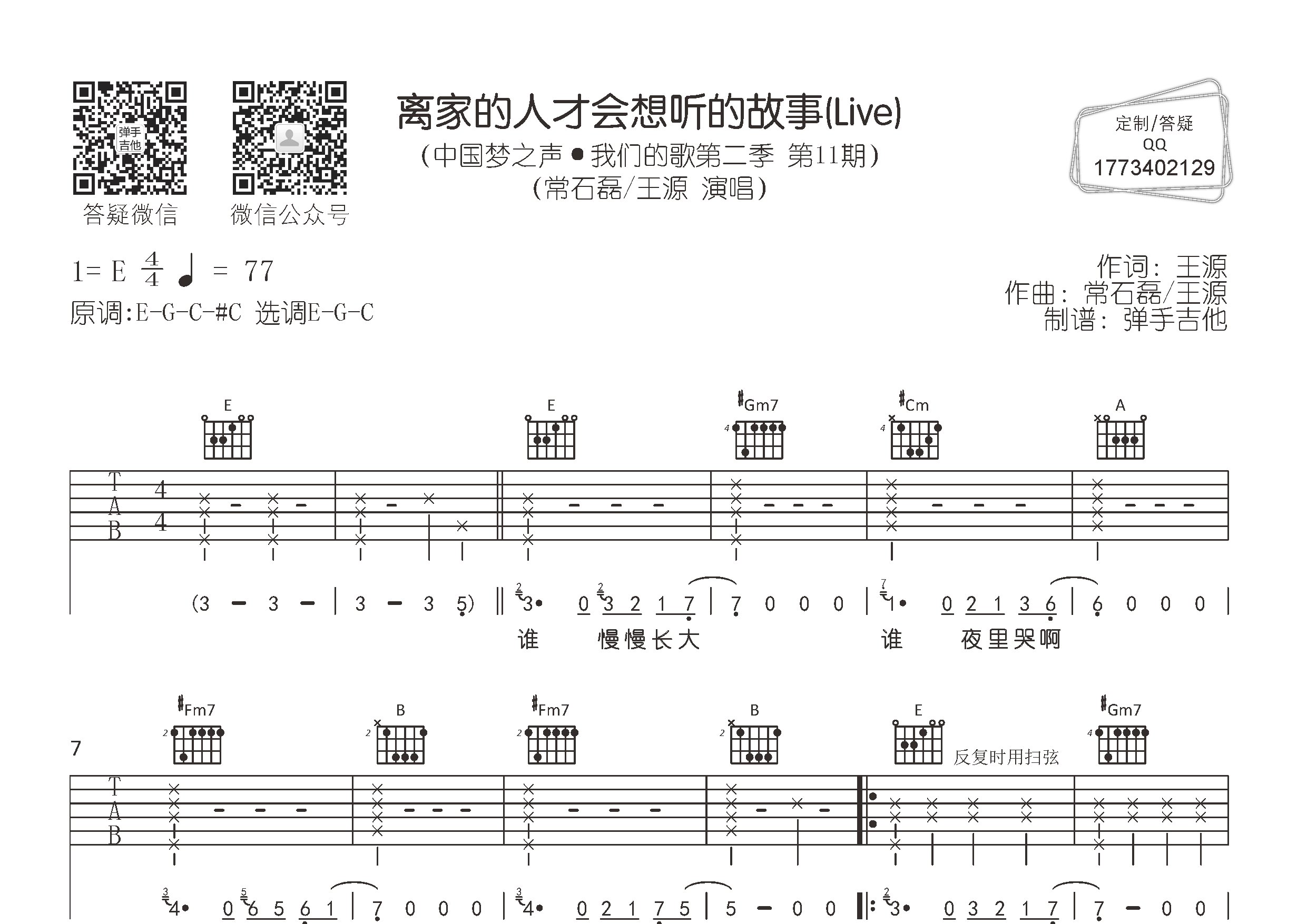 离家的人才会想听的故事吉他谱E调_常石磊/王源弹唱六线谱