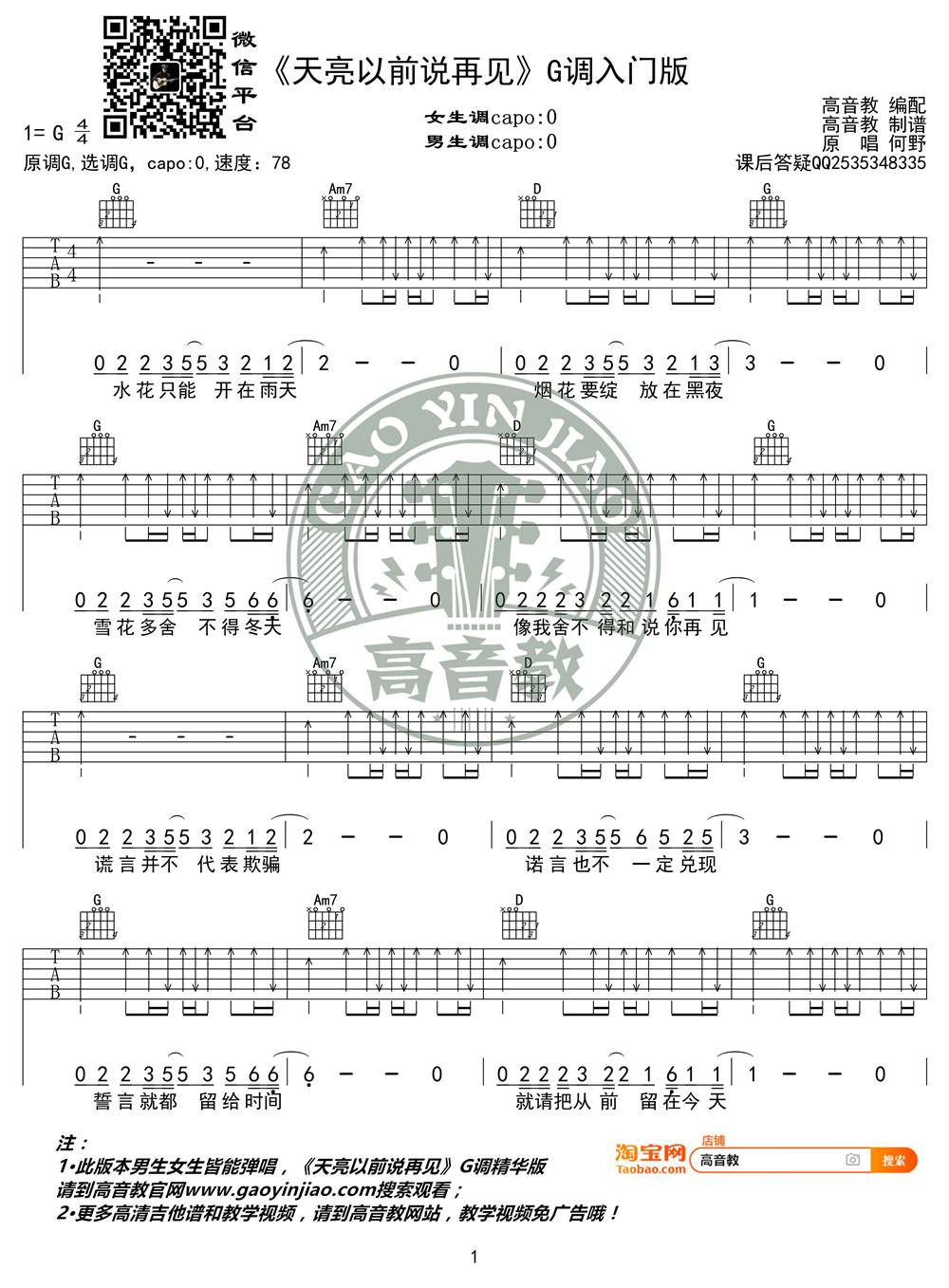 天亮以前说再见吉他谱 G调吉他弹唱教学_高音教版本_何野