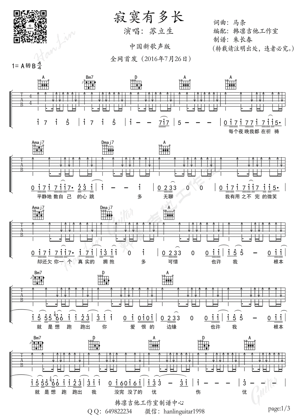 寂寞有多长吉他谱 A转B调_韩凛吉他编配_苏立生