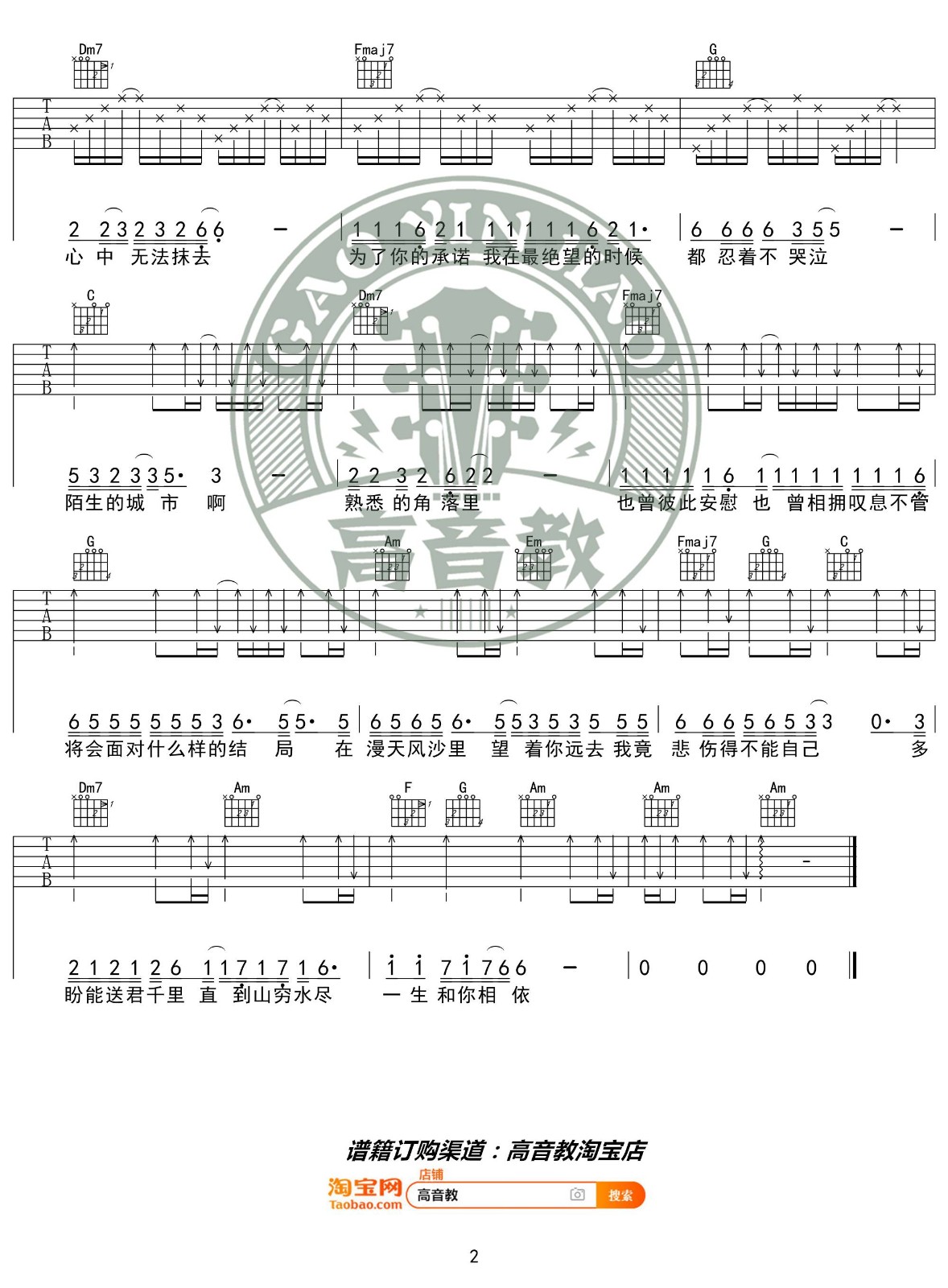漂洋过海来看你吉他谱采用了C调指法,由高音教编配完成。为了你我用了半年的积蓄,只为漂洋过海来看你,刘明湘的声音好温柔,听她唱这一首歌,我的心都要化了,我历尽千辛万苦,花光积蓄,努力练习,只为来到一座陌生的城市来看你,我爱你,可是我只能远远地望着你,成全你,看你的这一眼,也许是我的自我安慰,也许这一眼便是最后一次见面,我们以后彼此互不打扰,各自回到自己的生活。