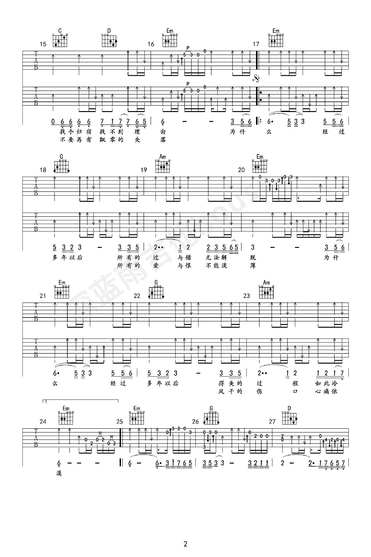 《多年以后》吉他谱 G调弹唱谱_姜育恒_深蓝雨吉他制谱