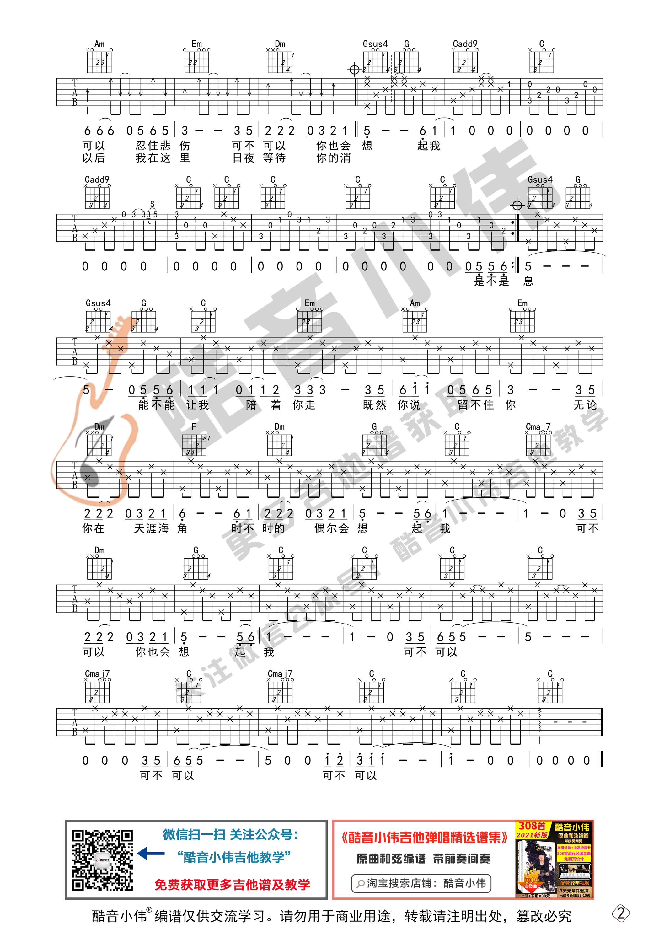 《把悲伤留给自己》吉他谱C调中级版_酷音小伟编谱_陈升