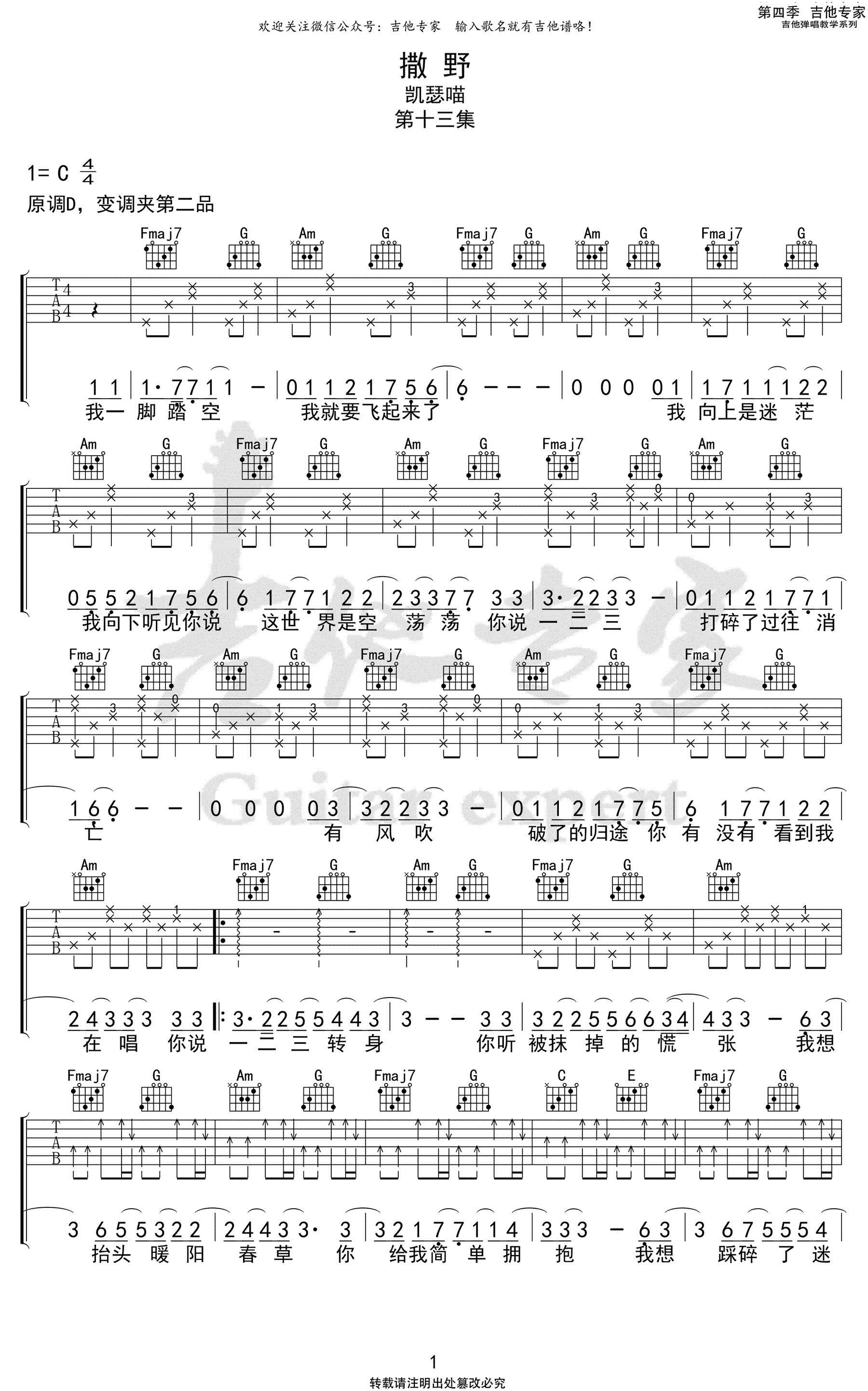 《撒野》吉他谱 C调弹唱谱_凯瑟喵_吉他专家制谱