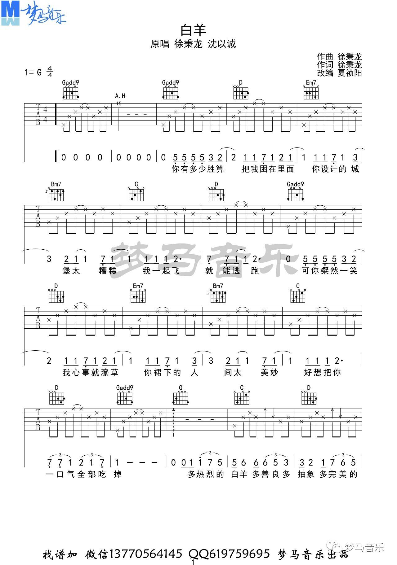 白羊吉他谱 G调简单版_梦马音乐编配_徐秉龙