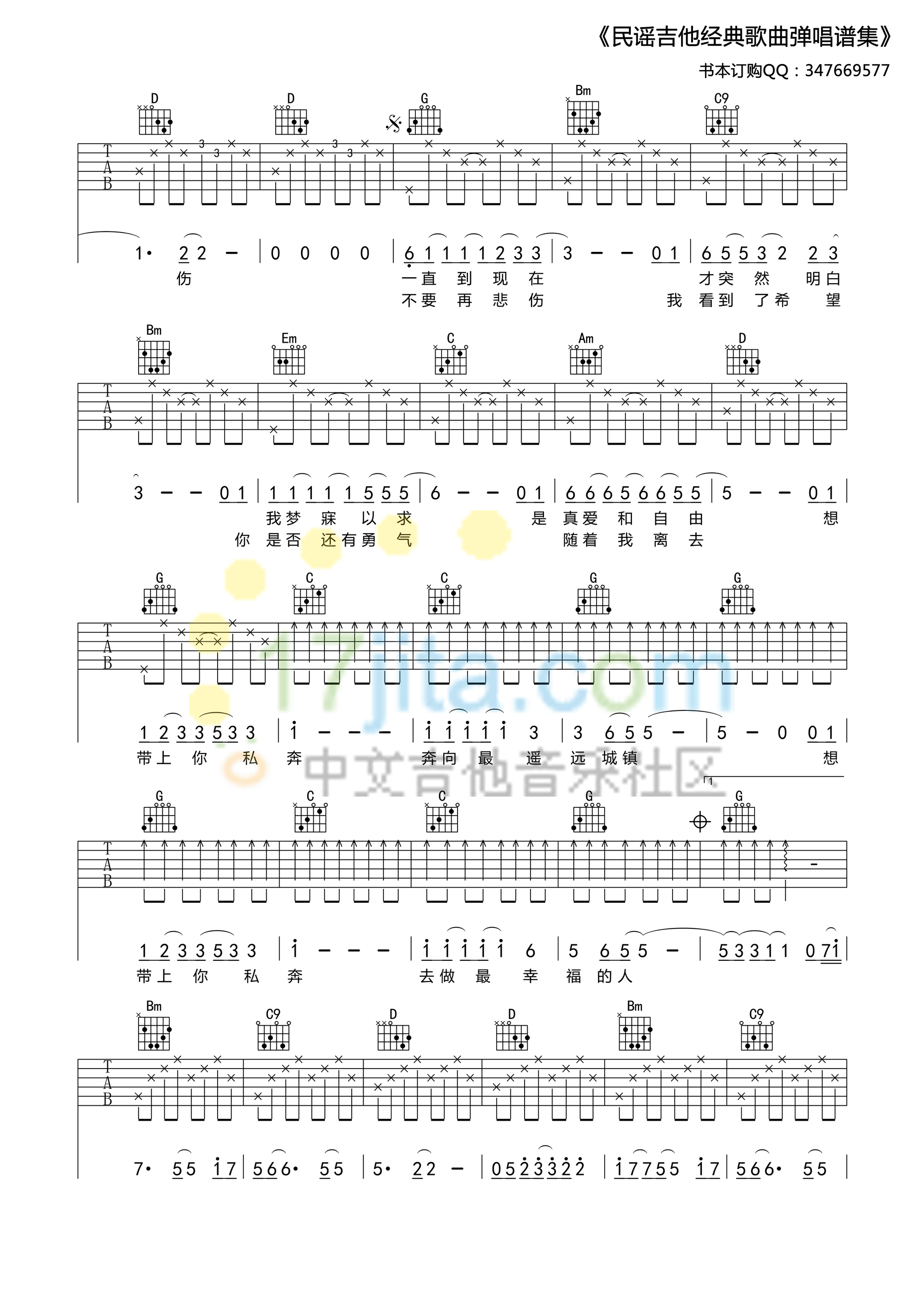 私奔吉他谱采用了G调指法,由17吉他编配完成。浪迹天涯这个词有一种潇洒的感觉,而和相爱的人私奔,就有着一种浪迹天涯的英勇,我们在天地之间,游山玩水,与山水作伴,多么惬意。如果你愿意,可以和相爱的人私奔一次,去到你们想去的地方生活,即使生活过得不是那么地容易,但是,在我疲惫的时候,有爱的人在一旁鼓励我,好像身边的阴霾都能一扫而光,阳光铺满了身旁。