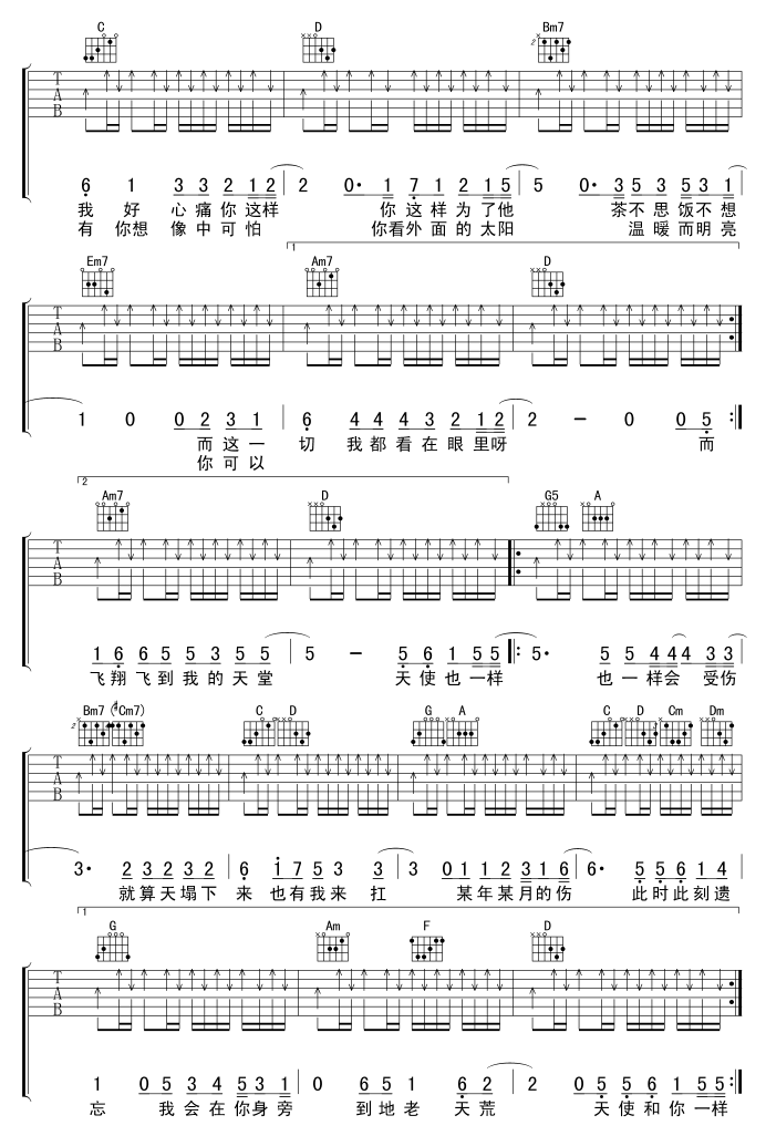 天使也一样吉他谱采用了G调指法,由中文吉他音乐社区编配完成。这首歌曲听着听着就让人留下了眼泪,这首歌曲向我们表达的是天使就像我们人类一样,他也会感觉到快乐,也会感觉到悲伤,我们都是有感情的,即使天使在爱情里也会受到伤害,更何况人类呢?爱情本应该就是幸福甜蜜的模样,我们却总是曲解了他最本来的模样,让那些我们爱的和爱我们的人受到伤害,而且还伤害了自己。