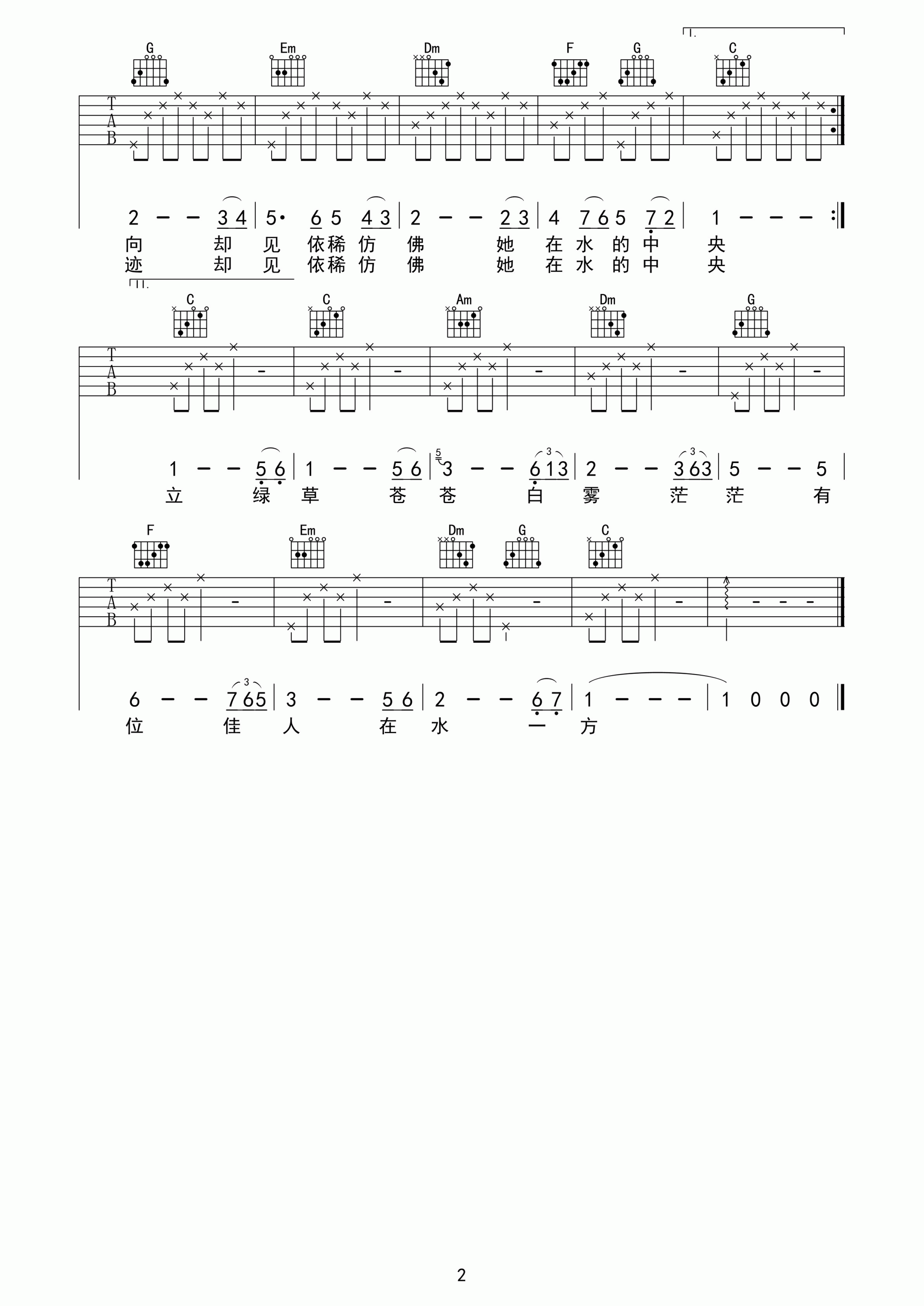 在水一方吉他谱采用了C调指法,由心动吉他编配完成。邓丽君的歌声柔情似水,犹如天籁,她的声线空灵,甜美,还带点忧伤之感,搭配上美妙动人的旋律,使我们听了非常享受,这是一首大家耳熟能详的歌曲,有位佳人在水一方,靠水而居,我愿逆流而上依偎在她身旁,无奈前有险滩,道路远又长,一首老歌,勾起我们的回忆,每一次听到这首歌曲,都会让我们想起了那些不在自己身边的那些人。