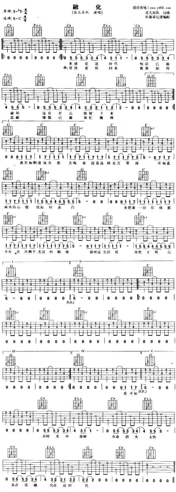 融化吉他谱 C调六线谱_新春记谱编配_花儿乐队