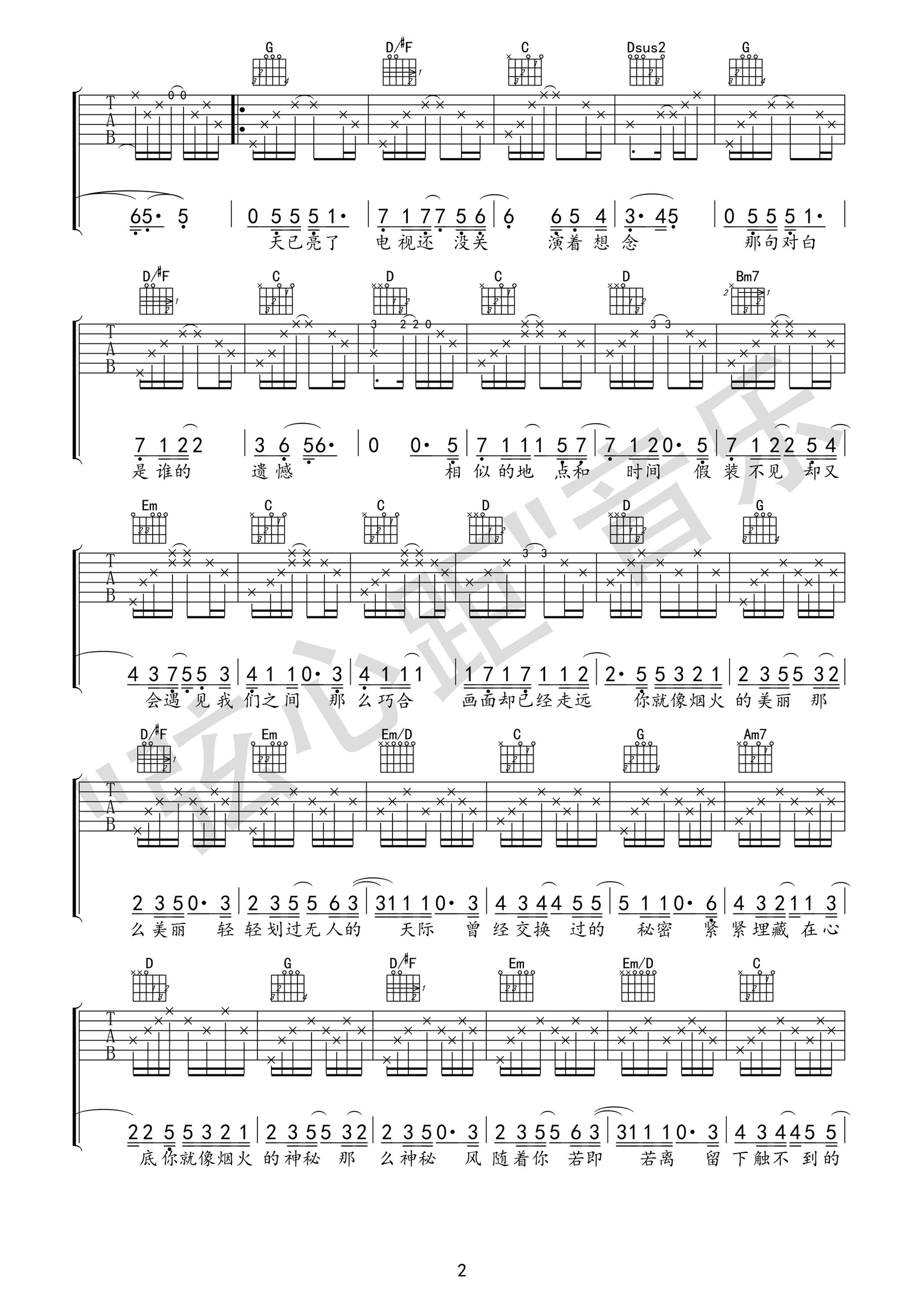 烟火吉他谱采用了G调指法,由弦心距编配完成。烟火是陈翔比较火的一首歌曲,这首歌比较具有的=他的个人风格相信很多看过他快乐男声比赛的粉丝们都知道他是属于翩翩公子型的歌手,声音非常温柔,人也长得很帅。虽然后来并不是得到前三名的成绩,但是这并不影响他后来的发展,他的声音条件很好,这首烟火也非常好听,足以 证明他的实力不仅限于快男这么简单。