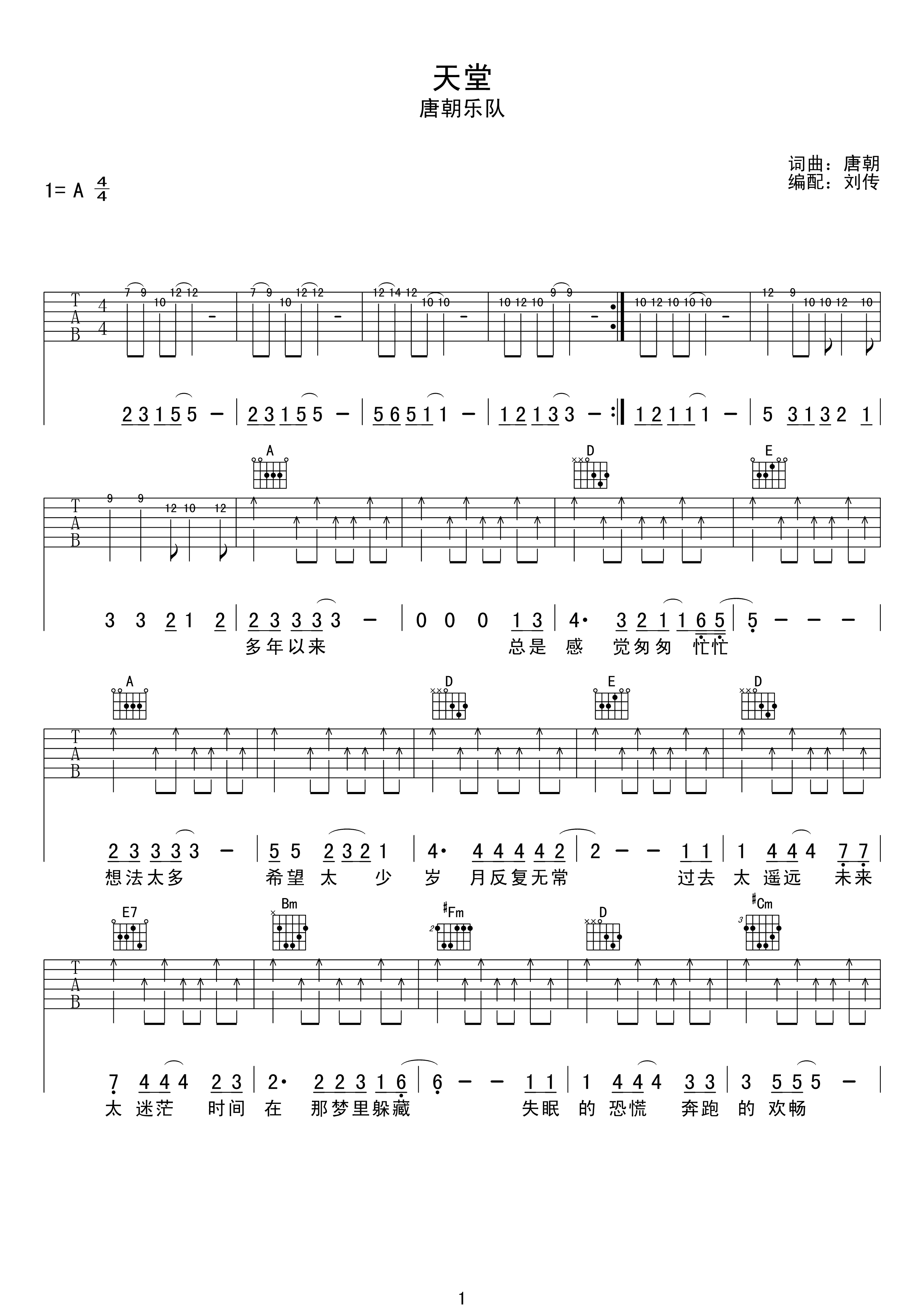 天堂吉他谱 A调_刘传编配_唐朝乐队