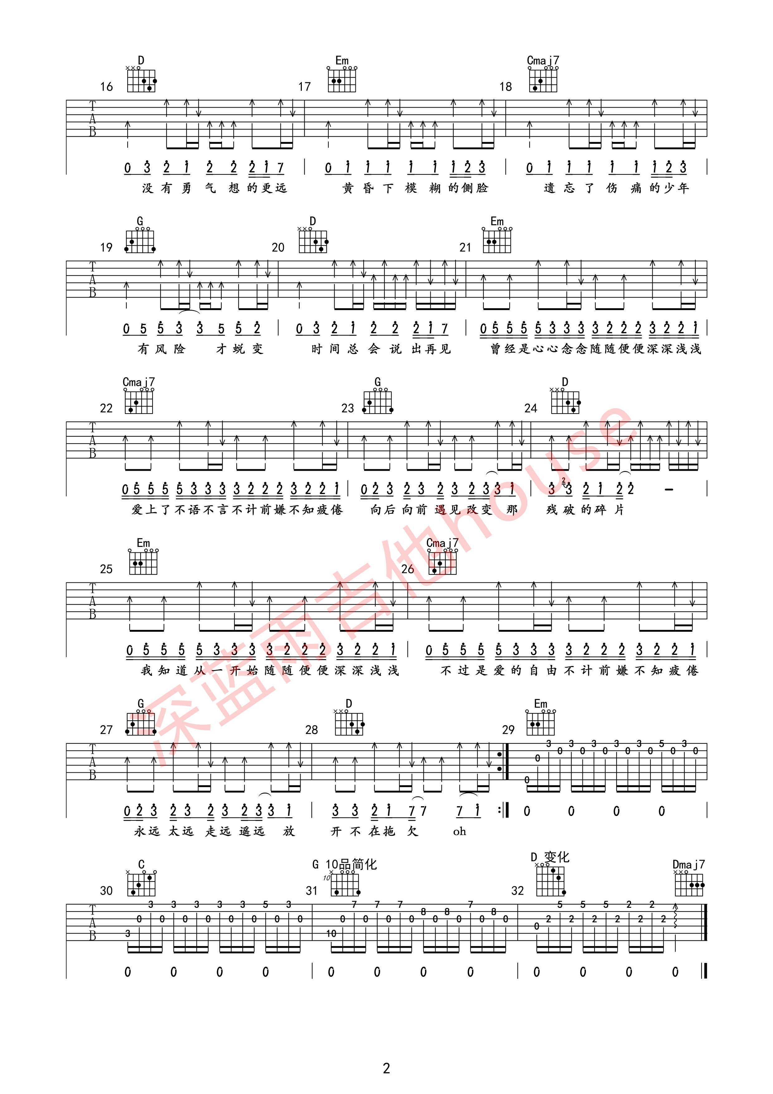 曲谱+教学 深蓝雨吉他,侧脸吉他谱采用了G调指法弹唱。整首歌曲的曲风利落洒脱,歌词略带伤感但却着重有力。人生就像一场长跑,会有激情高涨奋力奔跑的一段路程,也会有精疲力尽缓慢前行的一段路程,反反复复起起伏伏让人承担着风险,但只要不放弃调整好呼吸和状态,到达终点后总会有欢呼和掌声等着你。未知、选择和改变都是人生的一部分,时间带着我们经历一段又一段说“你好”和“再见”的路程。