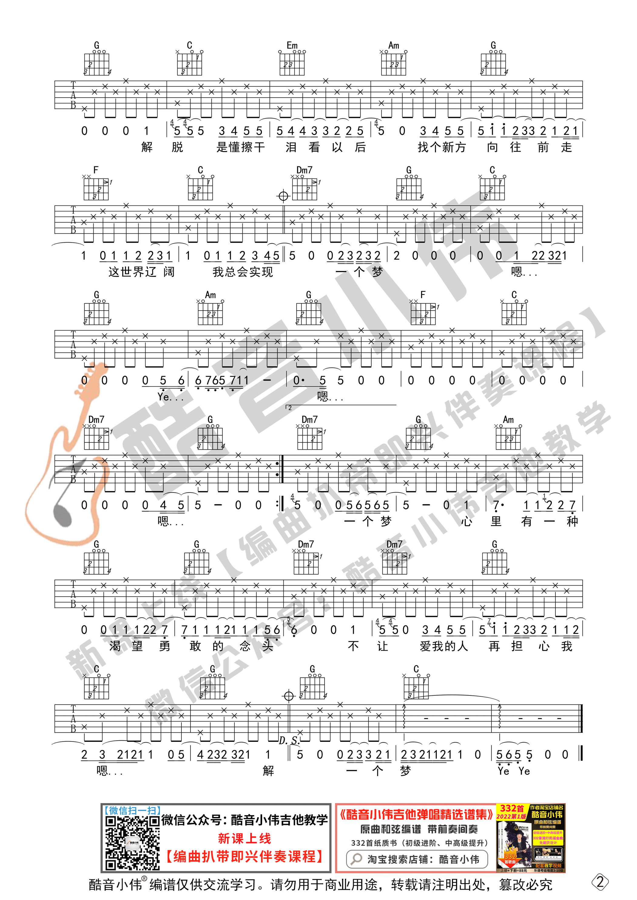 《解脱》吉他谱C调初级版_酷音小伟编谱_迪克牛仔