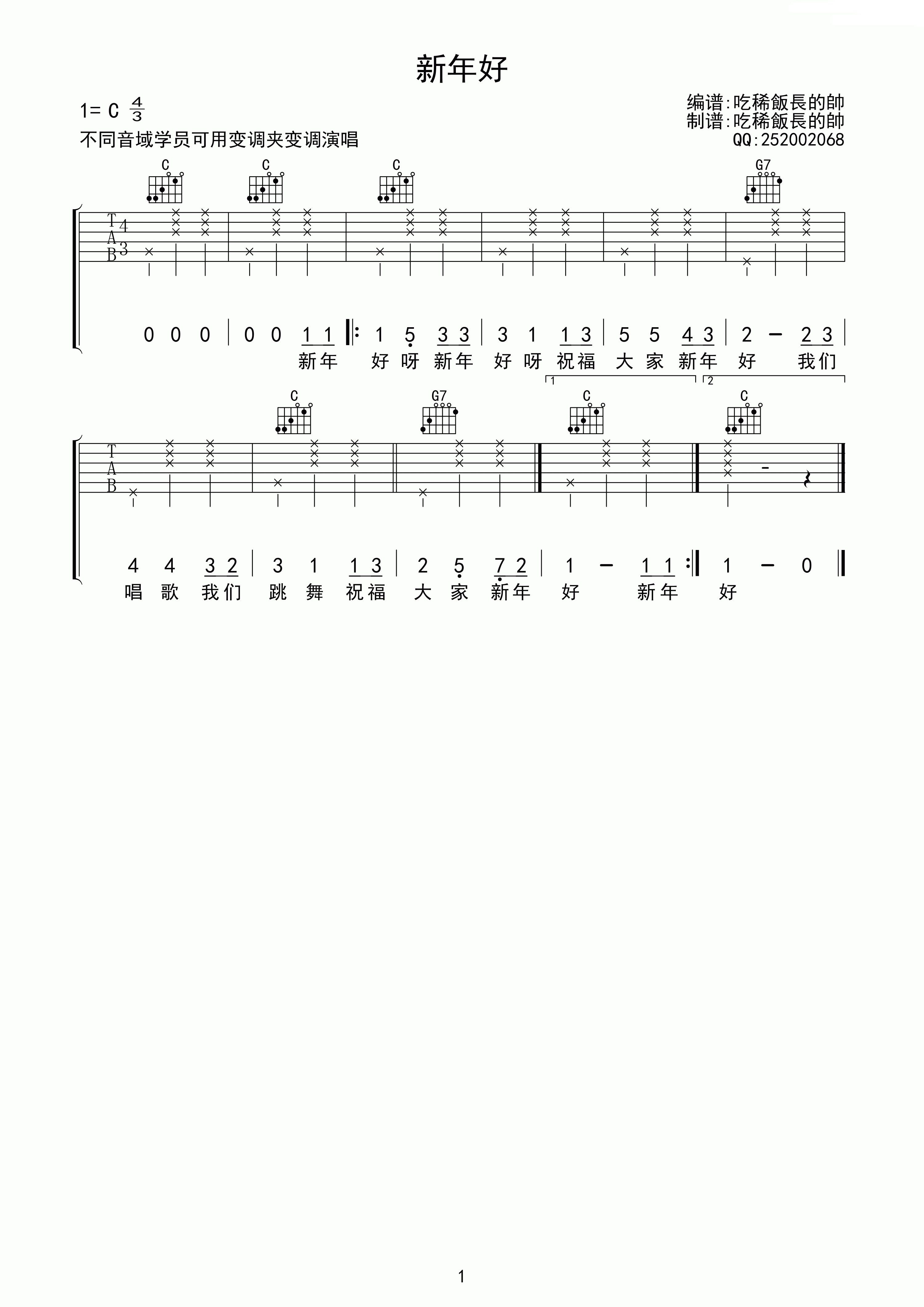 新年好吉他谱 C调高清版_吃稀饭长得帅编配_儿歌