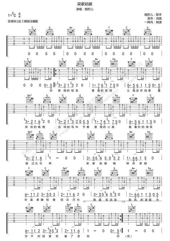 梁家姑娘吉他谱 C调扫弦版_一阵风编配_烟把儿乐队