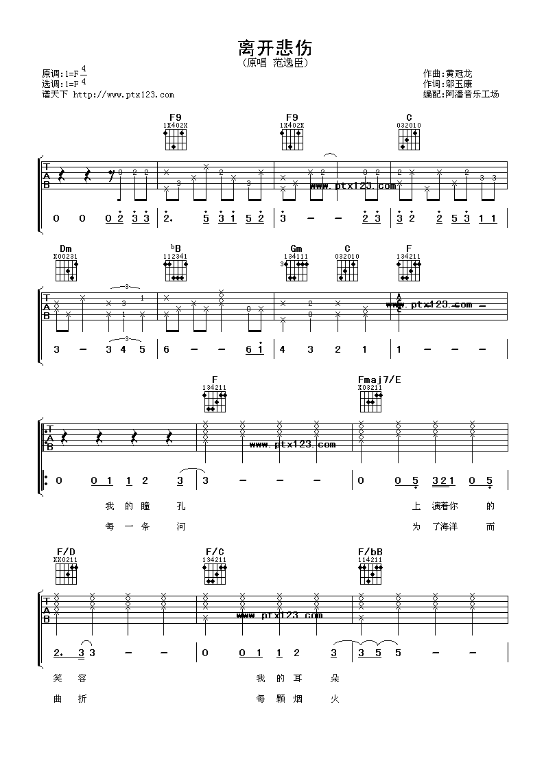 离开悲伤吉他谱 F调男生版_阿潘音乐工场编配_范逸臣