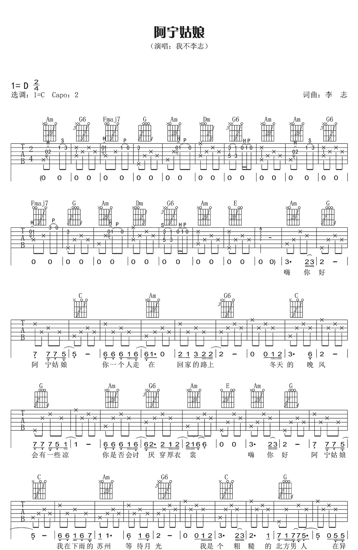 阿宁姑娘吉他谱 C调六线谱_附前奏_我不李志